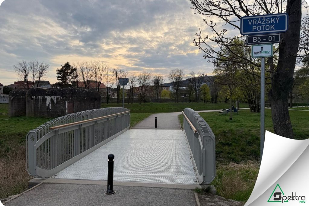 Pro projekt lávky přes Vrážský potok jsme zajišťovali kompletní projekční práce včetně zpracování podkladů pro výběr dodavatele.